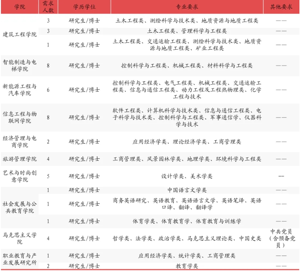 学校现有建筑工程学院、智能制造与电梯学院、新能源工程与汽车学院、信息工程与物联网学院、经济管理与电商学院、旅游管理学院、艺术与时尚创意学院、社会发展与公共教育学院、继续教育学院、马克思主义学院等10个二级学院、全日制在校学生1.2万人。总投资55亿元、总用地面积约1200亩的学校新校园计划于2025年9月启用。