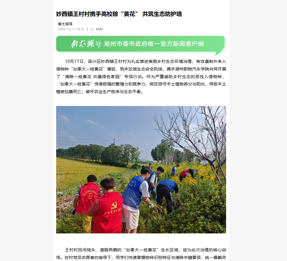 2025年10月17日《南太湖号》《湖州在线》报道了我校汽车学院联合妙西镇王村村共同开展了“清除一枝黄花 共建绿色家园”专项行动的相关新闻。